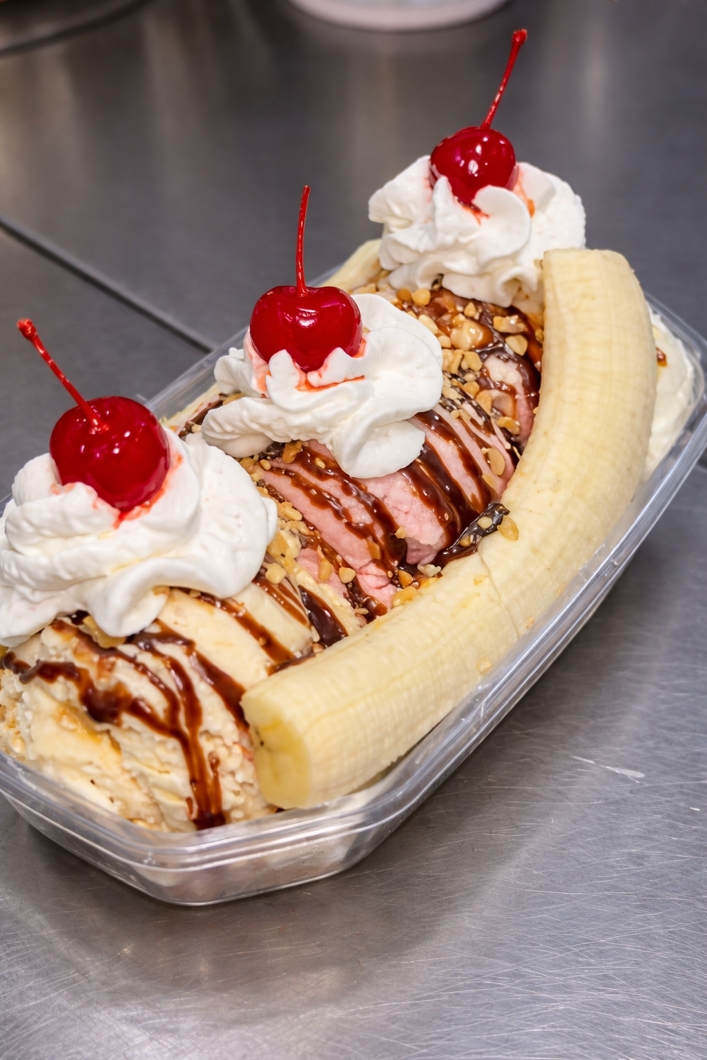 Classic banana splits stacked with rich ice cream, whipped cream, cherries, and sweet toppings.