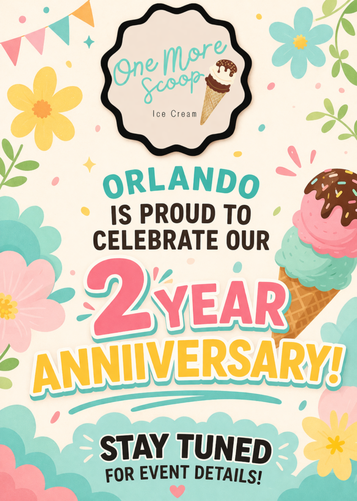 One More Scoop is a family-owned ice cream shop in Orlando serving premium frozen treats in a fun, welcoming space. From hand-scooped favorites and banana splits to milkshakes, bubble waffles, coffee drinks, and more, every visit is made to feel like a sweet little escape for families, friends, and dessert lovers of all kinds.